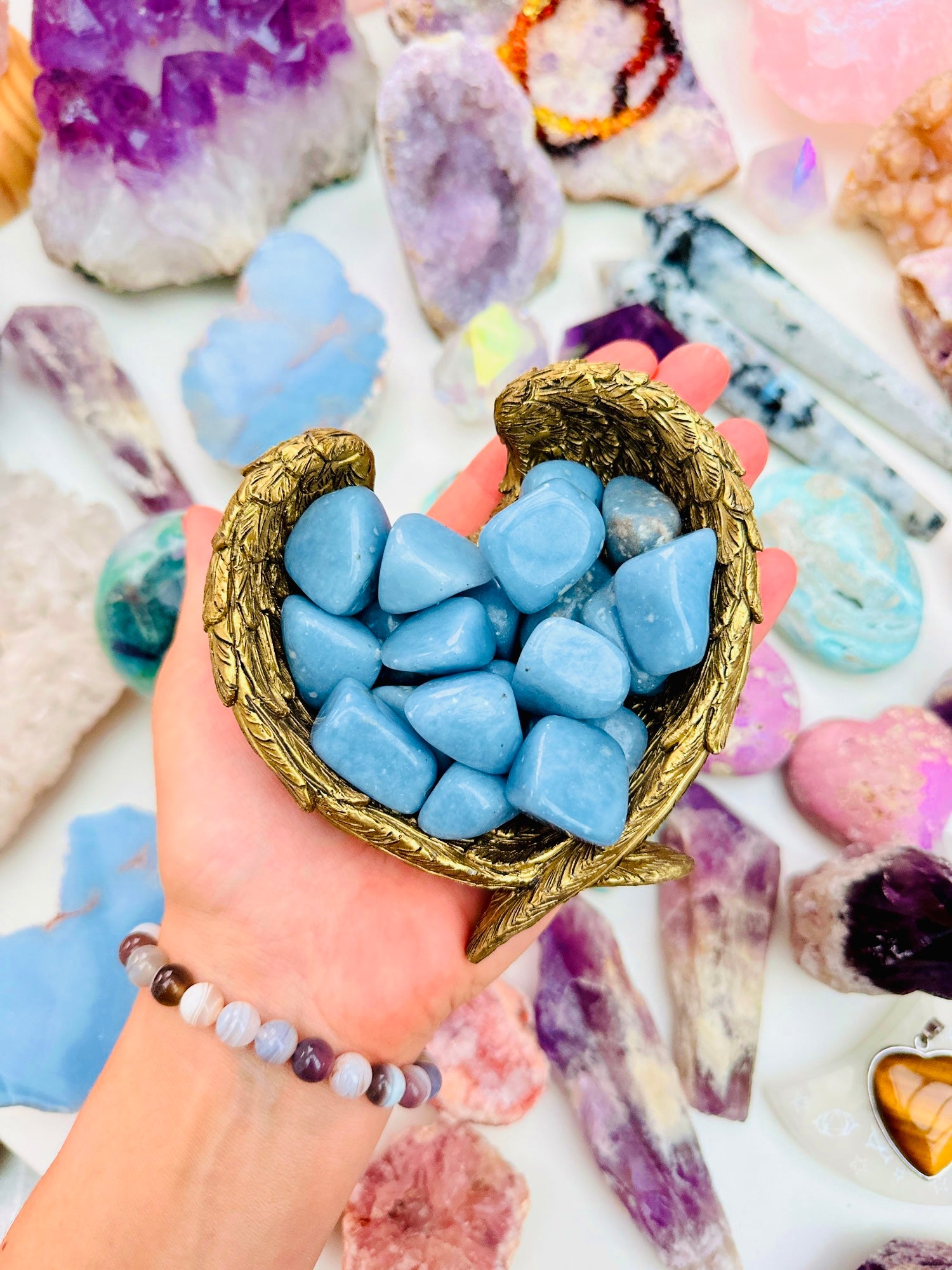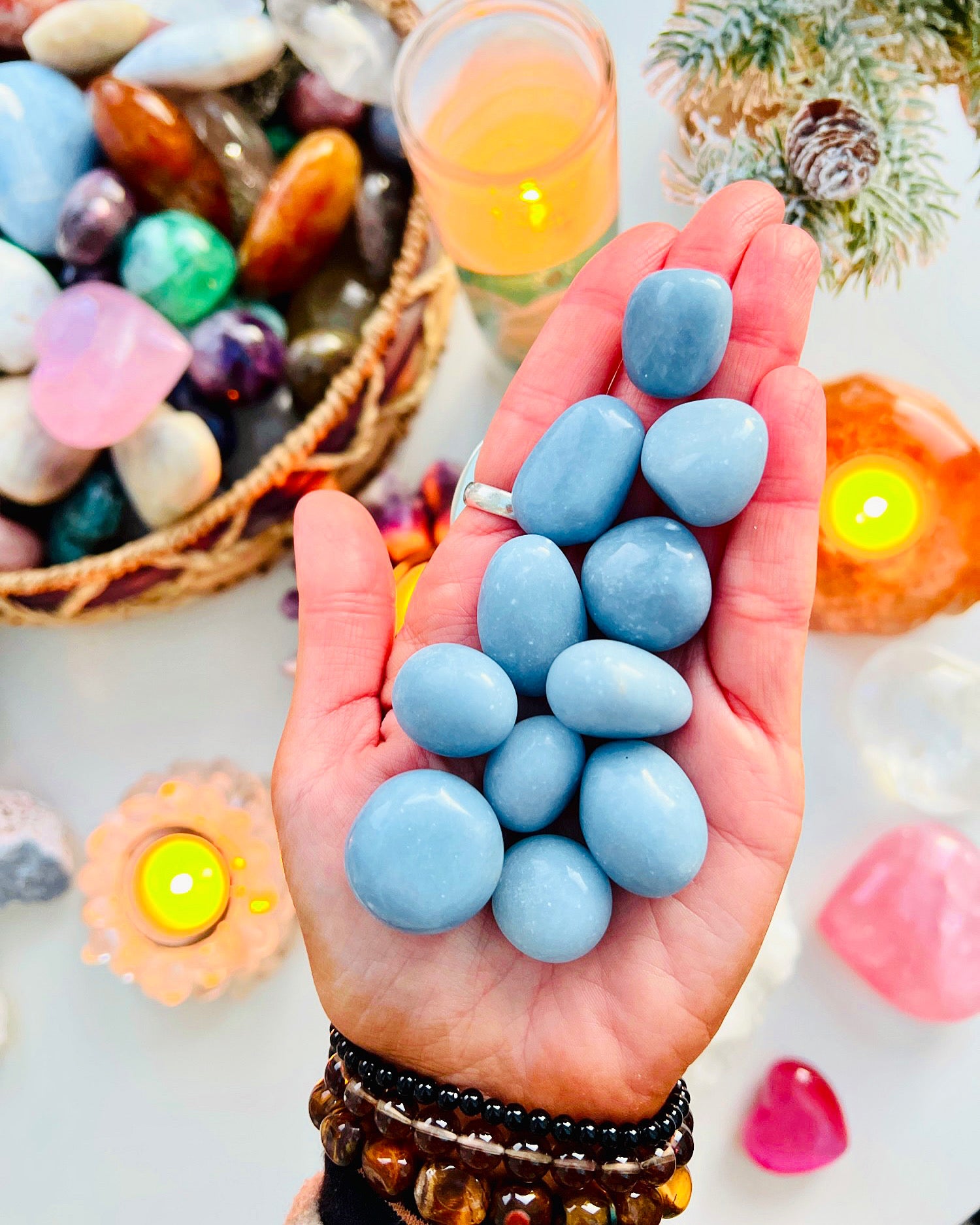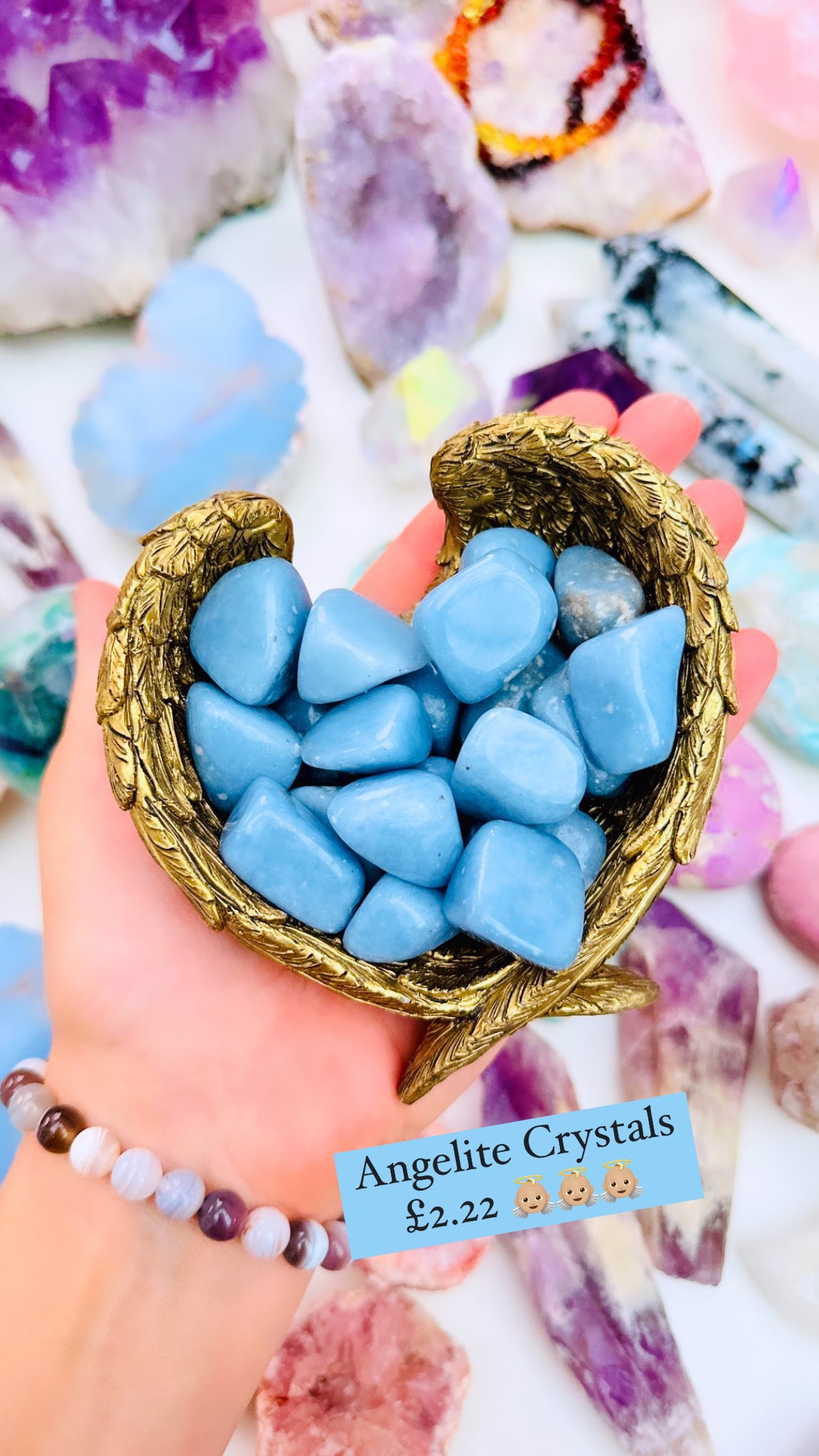 ๐ผ๐ผย Angelite Crystal Tumbles ๐ผ๐ผ๐๐ Angelite is the form of Anhydrite that brings us the softest energies in the mineral kingdom. It is so named as it seems to contain the soft, yet unyielding energy of the Angels ๐ผ๐ผ๐ผ๐ผ๐ผ๐ผ