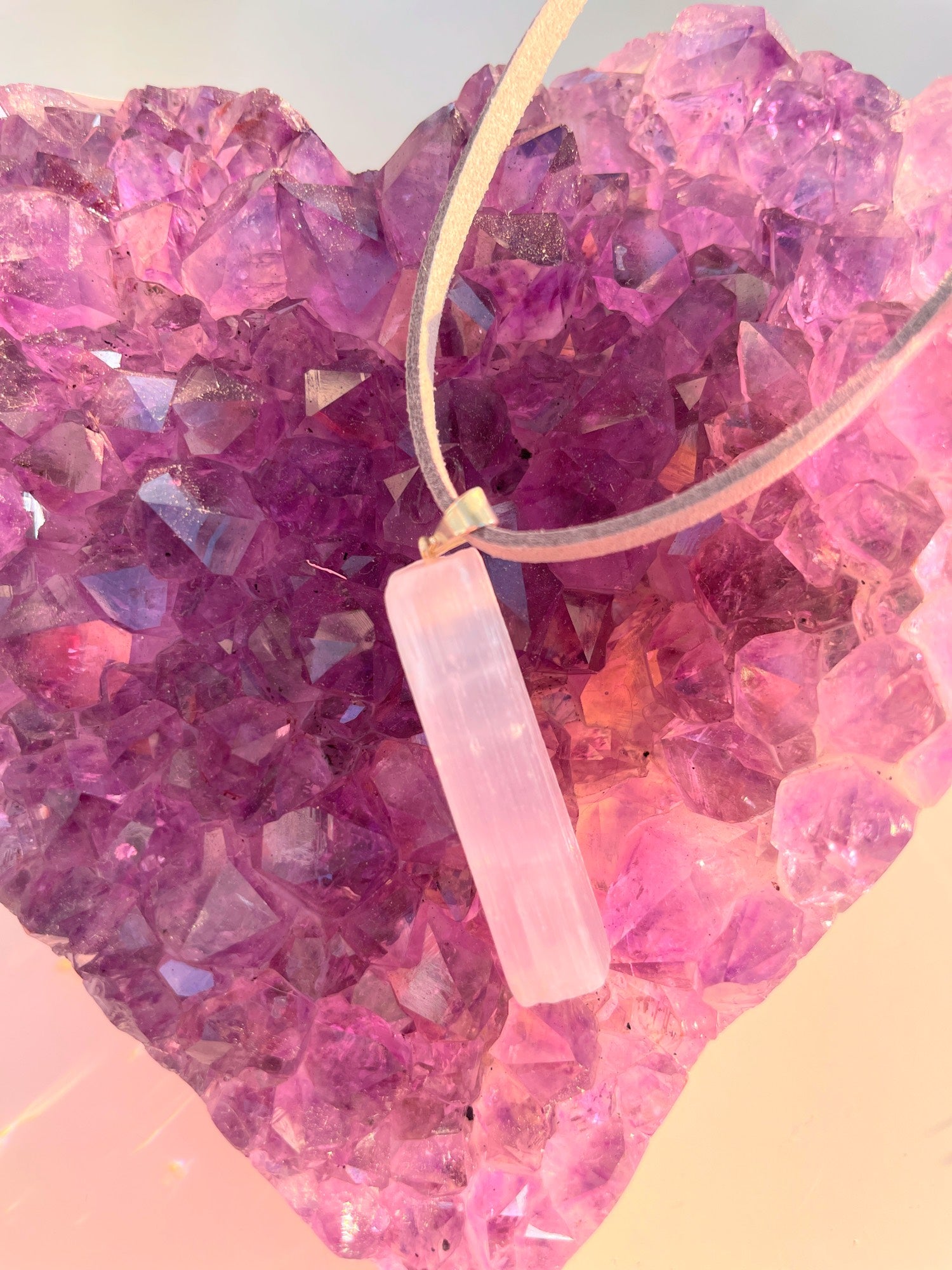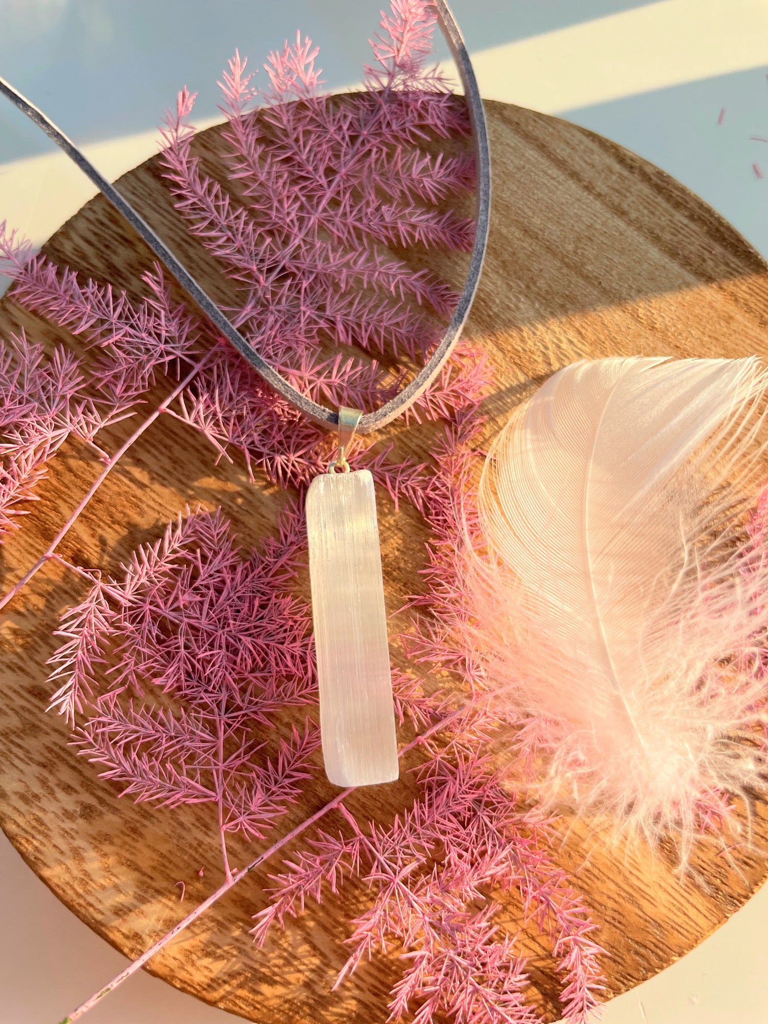 Selenite pendant on vegan suede ðĪ Selenite inspires a profound peace, and carries a fine, high frequency and intensity of energy that surpasses nearly all Crystal for opening, clearing, and activating the Crown and Higher Crown Chakras. It is ideal for meditation, spiritual work, connecting to ancient wisdom and knowledge, and is one of the best crystals for accessing your spirit guides and the angelic realm ðžðžðĪ #selenite #angels #vegan #wisdom #crownchakra #peace